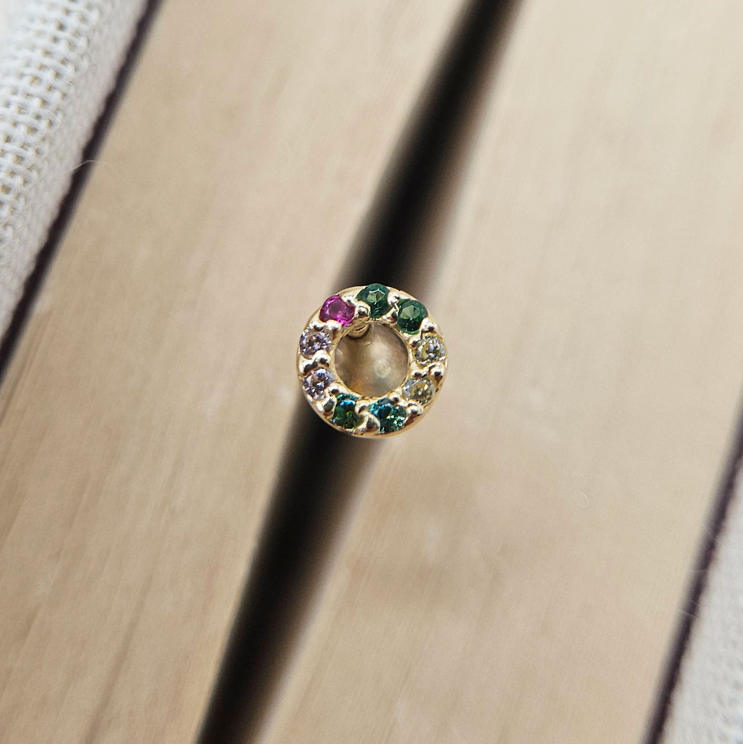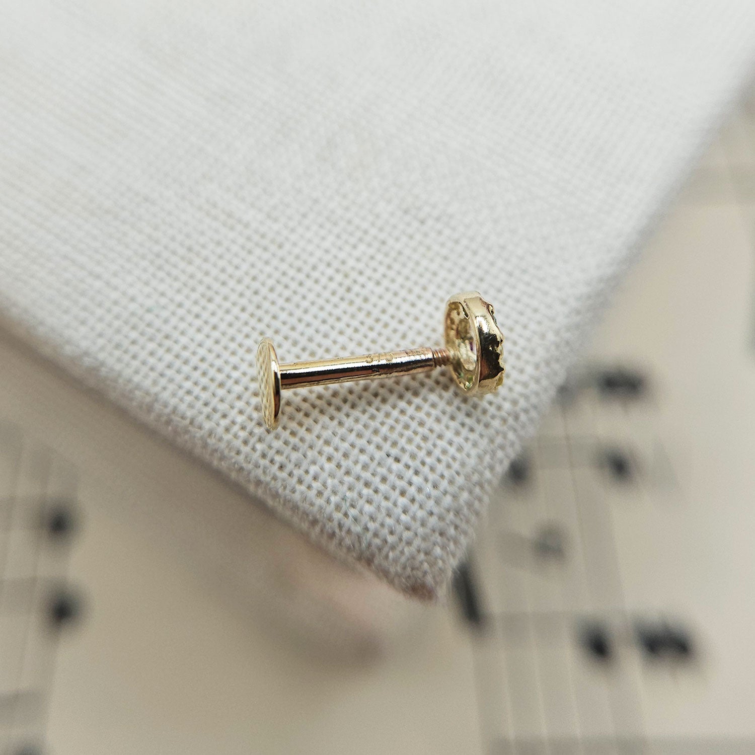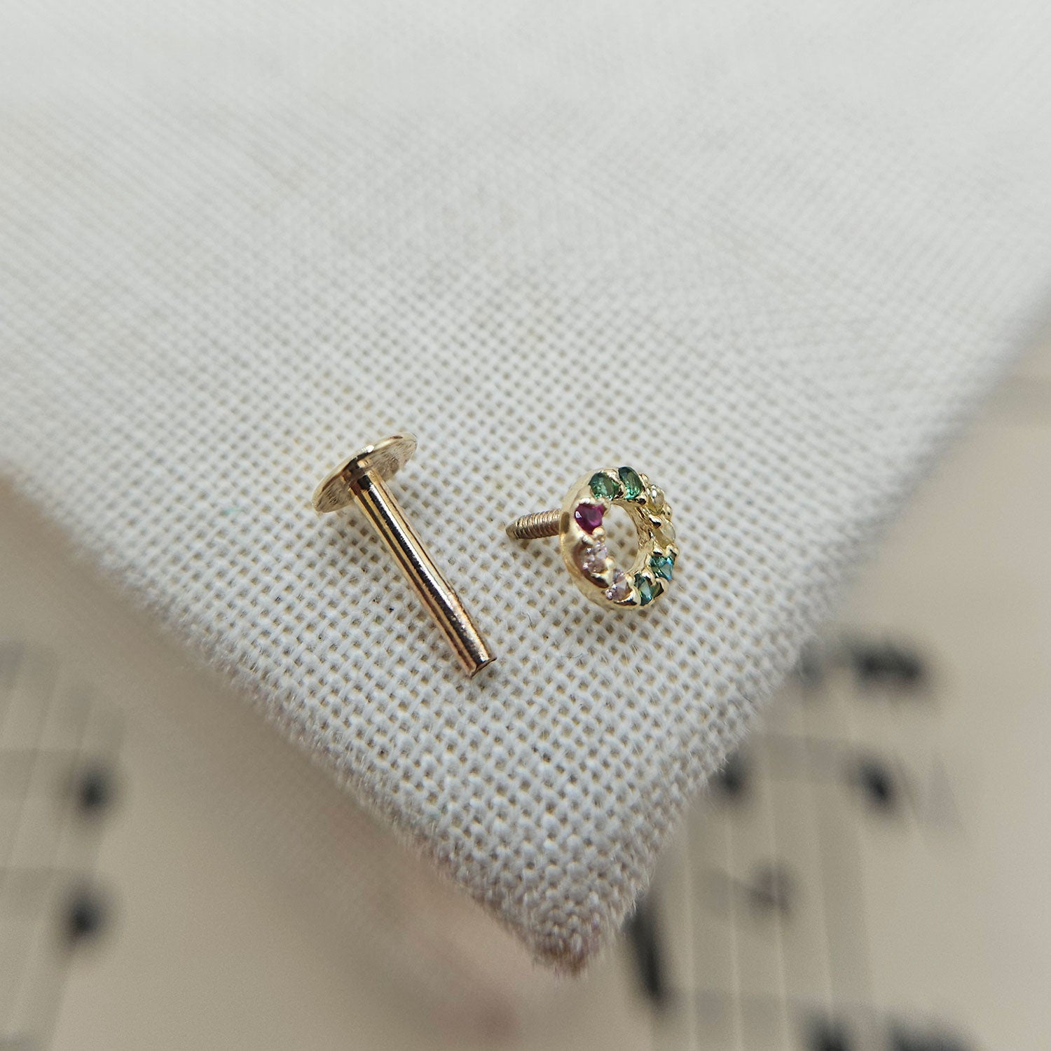 A beautiful gemstone circle labret helix earring, masterfully crafted from solid 9ct yellow gold. The stunning 4mm circular design features brilliant cubic zirconia stones that catch and reflect light beautifully, creating a mesmerising sparkle that complements the warm golden setting. The flat back construction with internal threading ensures maximum comfort and security, though please check the post length of 6mm is long enough before ordering