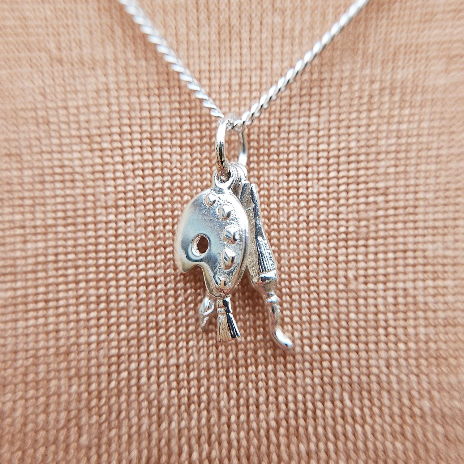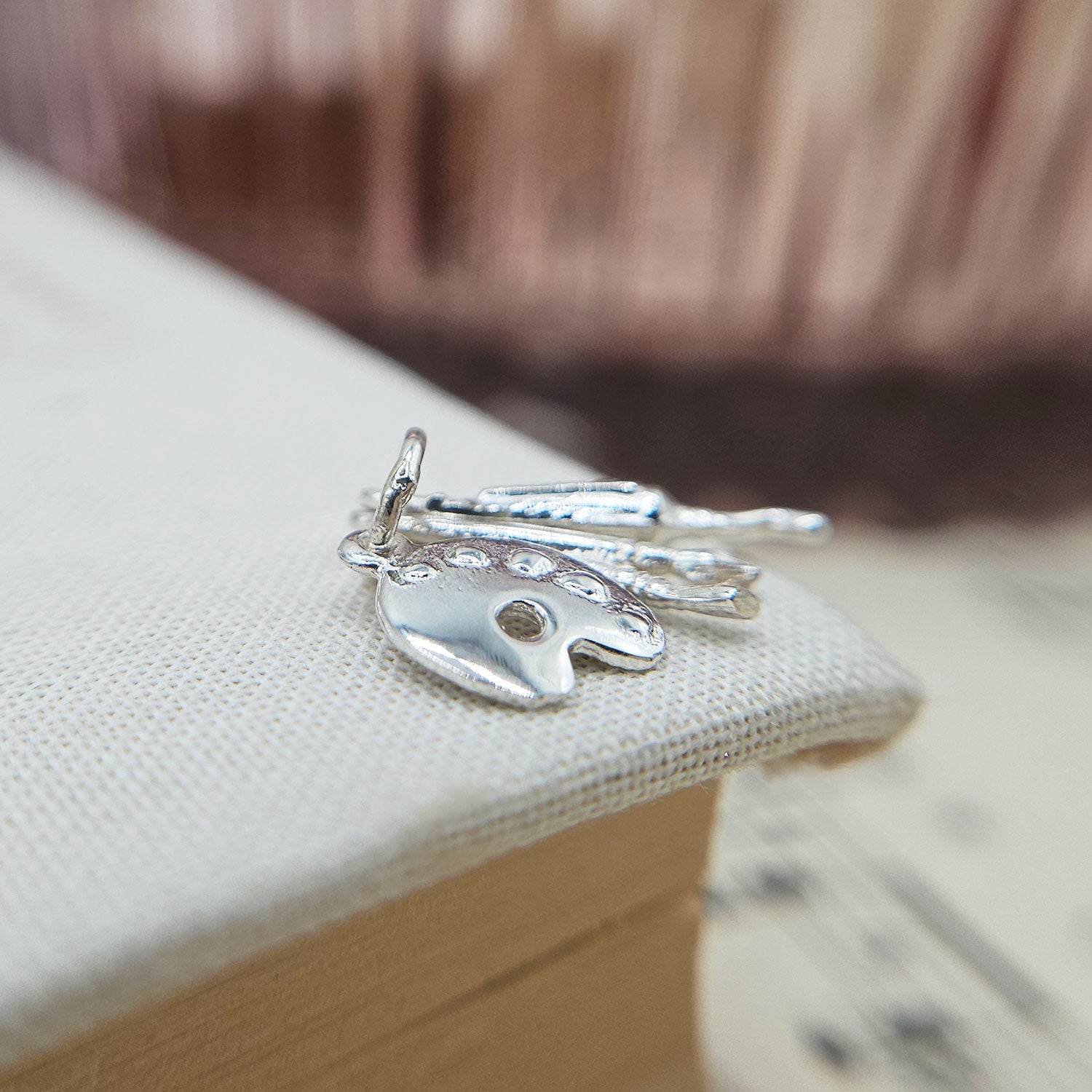 This artist's charm - featuring paint, brushes and a palette - has been cast in Birmingham's jewellery quarter in solid 925 sterling silver. This lovely charm trio weighs over a gram in weight and can be purchased as a standalone item, or as a necklace on a fine sterling silver curb chain (not hallmarked). A really special piece of jewellery to treasure with an English hallmark on the charm loop. Your artist's charm will arrive beautifully boxed and ready to gift.