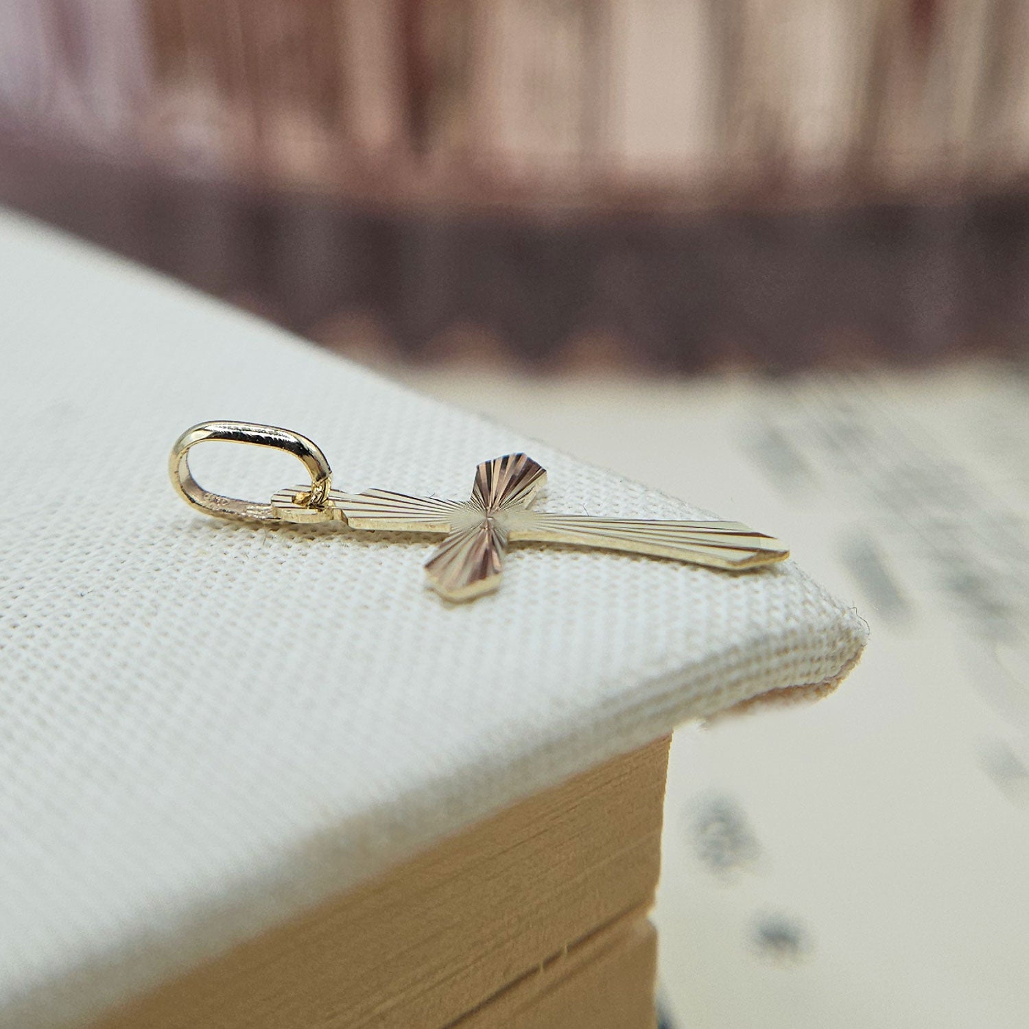 Weighing just 0.24 grams and measuring only 1.1cm wide, this is a lightweight flared cross perfect for layering on fine chains. Despite its very small size, the diamond cut starburst pattern ensures it catches the light beautifully from every angle.