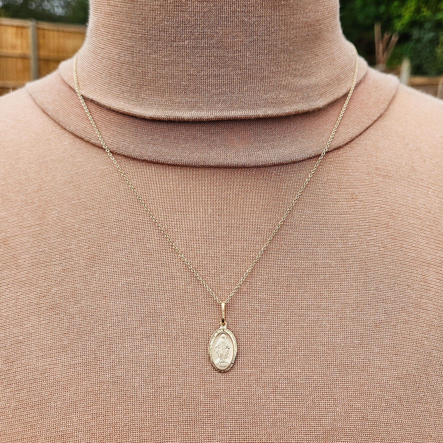 A treasured symbol of faith and protection, beautifully crafted in 9ct yellow gold. This elegant oval Miraculous Medal pendant features the traditional image of Our Lady, making it a meaningful piece for those seeking spiritual connection and divine protection. The petite oval design is perfectly proportioned for everyday wear.