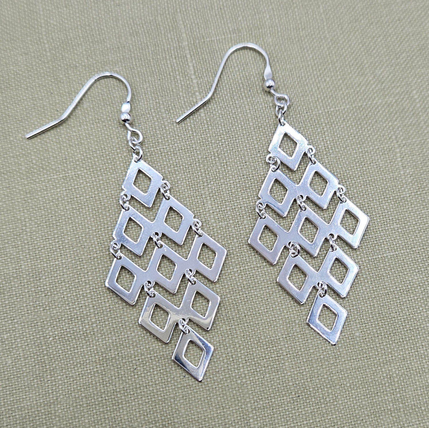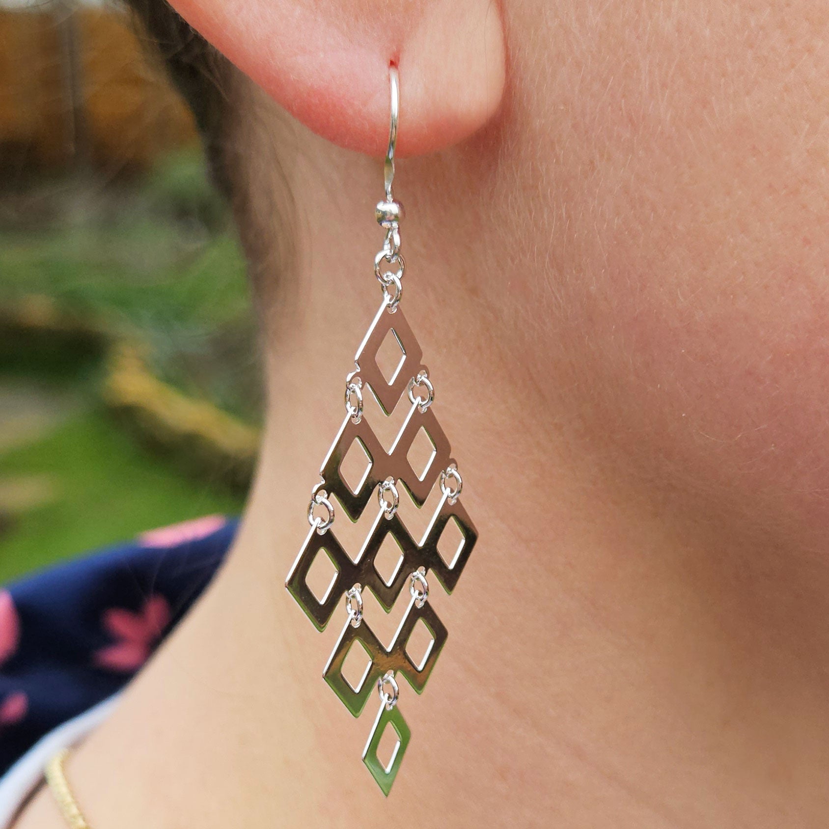 These articulated lozenge dangle earrings are crafted from solid sterling silver and feature a cascade of lozenge-shaped segments that move beautifully with every step. Measuring 6 cm in total length and 2.9 cm in width, they’re bright, eye-catching, and designed to make a statement.