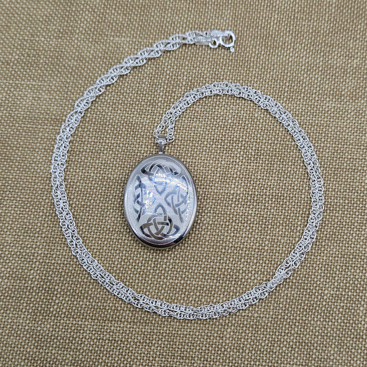 A timeless keepsake that combines ancient symbolism with contemporary craftsmanship, this medium-sized locket showcases an intricate Celtic knot embossed on its front face. The reverse features a sleek brushed silver finish, creating an elegant contrast that makes this piece equally beautiful from every angle.