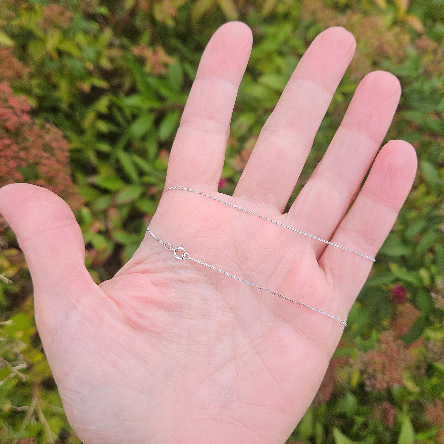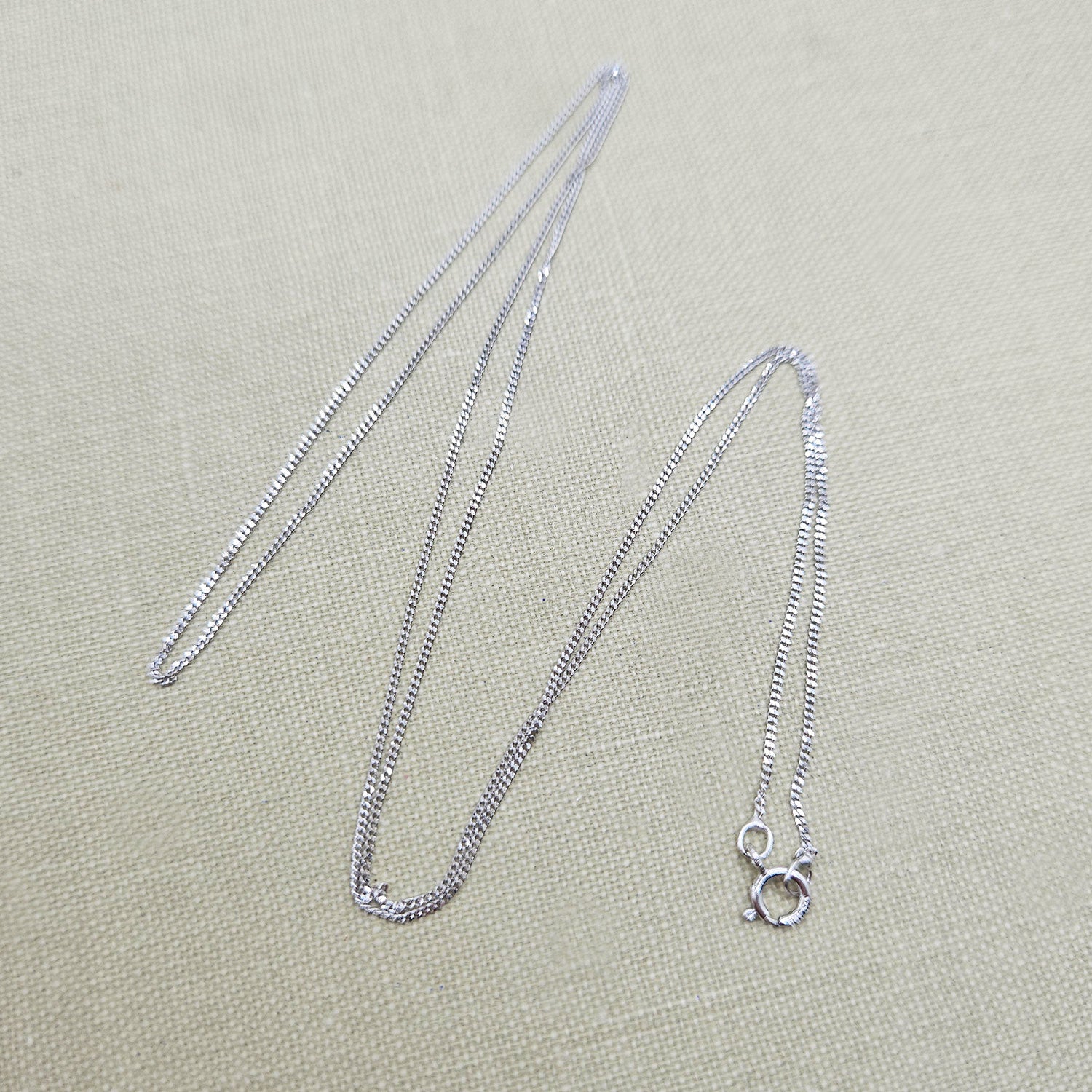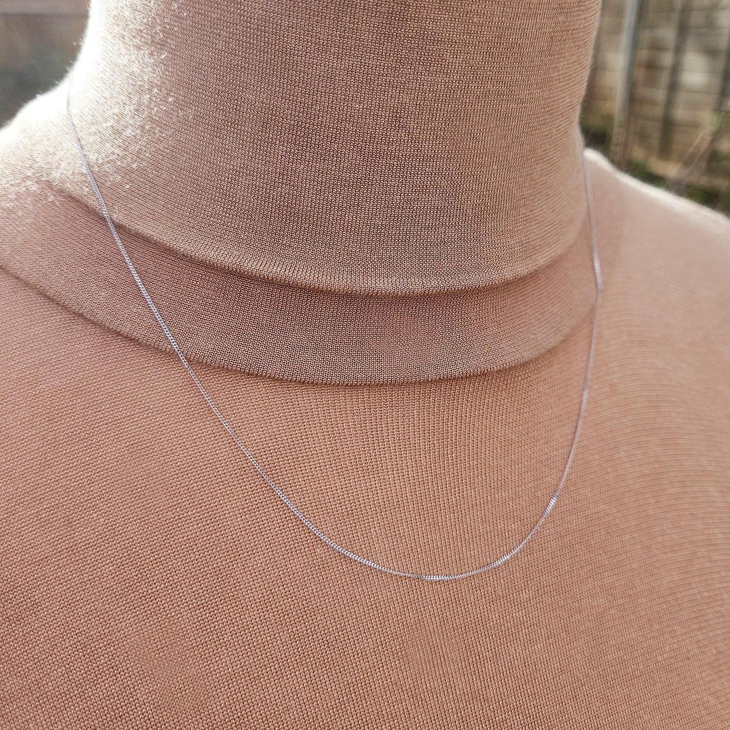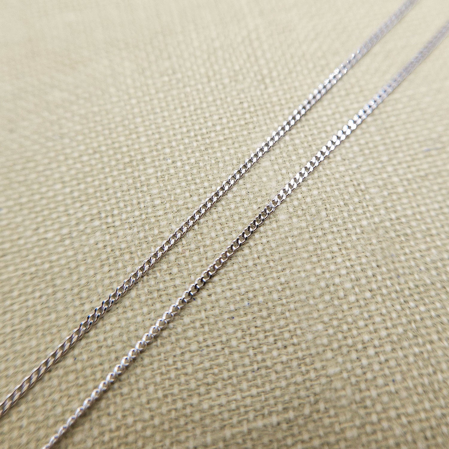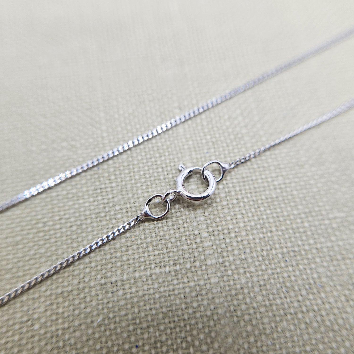 Crafted from solid 9ct white gold, this super fine curb chain offers a delicate yet beautifully polished finish. Measuring just 0.8 mm wide, it features a diamond-cut design that gives it a subtle, eye-catching sparkle despite its slender size.
